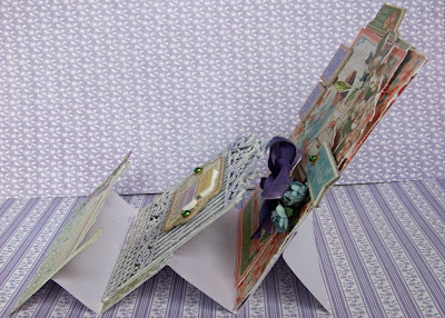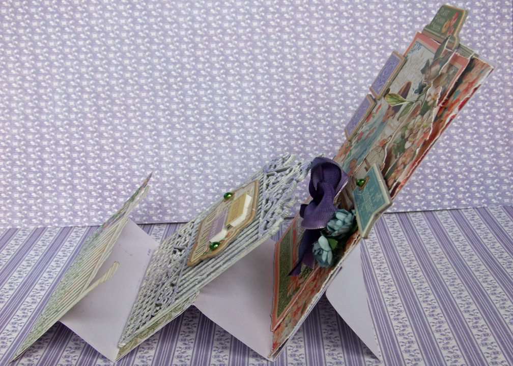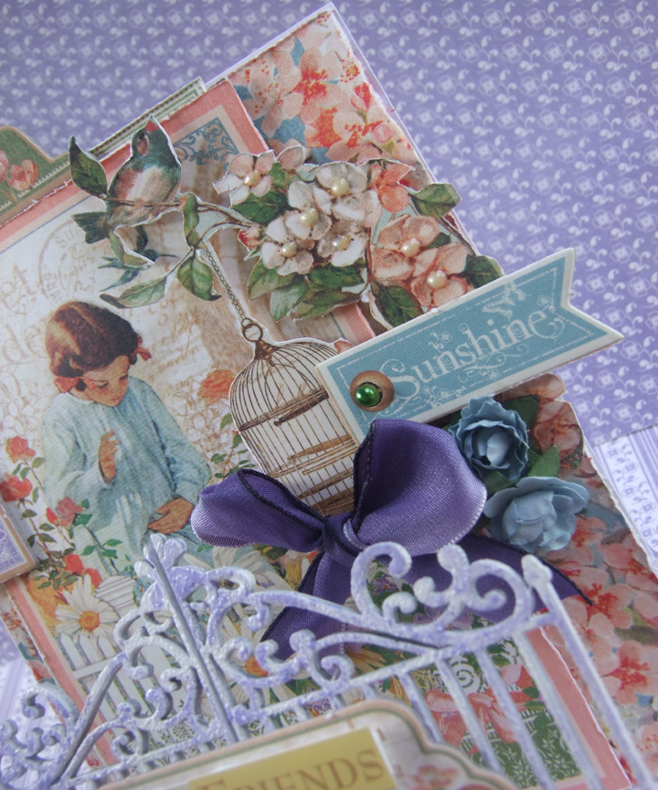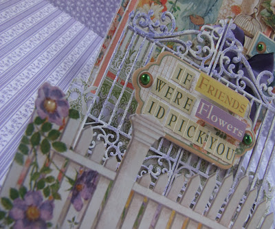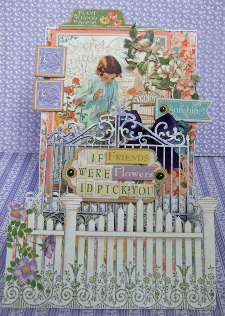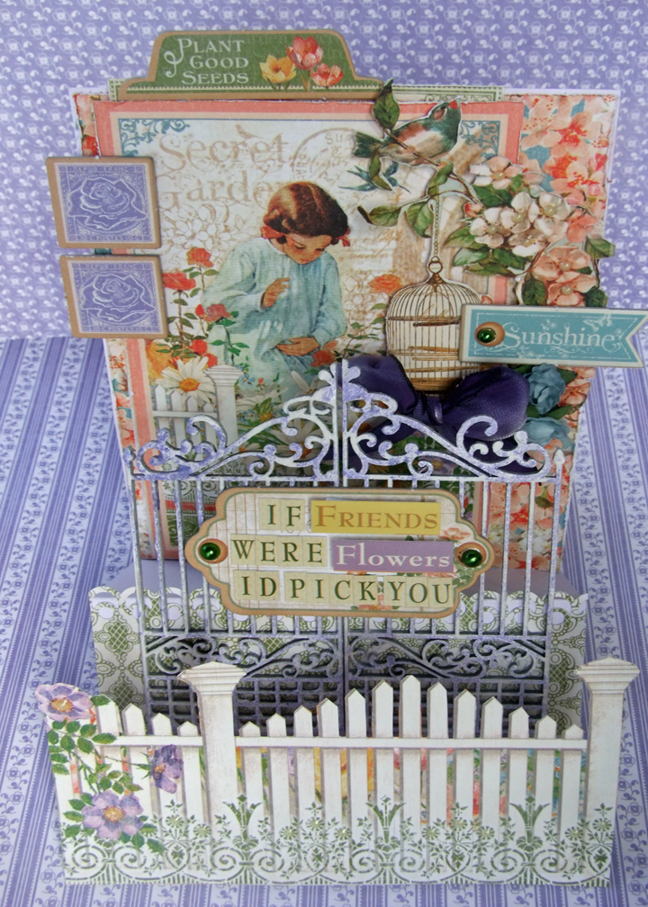 The card is now ready to decorate! The sky's the limit on how you want to decorate but if you would like to follow my card here is what I didYou will needTapeGraphic 45 Secret Garden chipboardGraphic 45 Secret Garden Alphabet StickersGraphic 45 Secret Garden Meadow Lark paperGraphic 45 Secret Garden May Flowers paperGraphic 45 Secret Garden Springtime paperGraphic 45 Secret Garden Secret Garden paperKaisercraft Wooden Flourishes Iron GateKaisercraft Mini Blooms Icebergloopy style border punchscissorsgessoImpastoShimmerz PeriwinkleFoam BrushLiquid pearls yellowPearls X3 in greenFoam TapeGlueRibbon (purple)1. Fussy cut the left side of the fence from the Secret Garden paper. Stick this to the first small flap of the base.2. Use the reverse side of the Secret Garden paper. Cut 5X6 inches. Distress the edges. Stick this to the larges back flap of the base3. Cut a piece 2X5 inches from the Meadow Lark paper using the green/white pattern side. Punch a loopy style border along the top. Stick this to the second flap on the base4. To decorate the gate first paint with a coat of gesso. Make a mixture of gesso/impasto. A small blob of each with slightly more Impasto than gesso. Use a foam brush to mix it together. The mixture needs to be fairly thick. If it is runny you will not get a textured look. Use the foam brush & dab/sponge the mixture onto the gate. The texture should be lumpy & uneven. Once this is dry use the foam brush (or a paint brush) to apply Shimmerz in Periwinkle. Roughly dab/paint the shimmerz on so the coverage is uneven. Put it aside to dry.5. Fussy cut the rectangle box from the May Flowers paper of the image of the little girl. Distress the edges6. Make a small pocket at the back of the May Flowers piece with some cardstock approx 4X3 inches. Stick the pocket to the back of the May Flowers piece on 3 sides only. Do not stick the top of the pocket. I used a fine bead of glue on the 3 sides so that I could slide another sheet of paper up & down. You could also use a very thin piece of tape7. Fussy cut the rectangle with flowers along the top & the butterfly stamp at the bottom.Cut right up to the green border so that it measure approx 3.5 X 5.5 inches. Distress the edges. Sick a chipboard tab along the top. Slide it in the May Flowers pocket8. Stick the May Flowers piece (with the pocket & insert) onto the large flap at the back of the base. Stick it to the left hand side9. Fussy cut the bird,flowers & cage from the Springtime paper (top left image) Stick on back flap of base with foam tape. Stick the chipbaord sunshine piece with glue so it partially covers the cage & flowers. Place a pearl on the chipboard piece10. Make a small bow from ribbon. Stick this on the back flap of base at the bottom of the cage. Stick X2 mini blooms around bow11. Take X2 purple squares from chipboard. Stick on back flap of base on left hand side.12. Take the gate which should now be dry. Glue on second flap of base13. Take a chipboard Tab. Use mini green alphas from alphabet sticker sheet & words Friendship (snip the hip off) & Flowers. Spell out If Friends were flowers Id pick you. Use Foam tape to stick on Friends & Flowers14. Use glue to stick chipboard Tab onto centre of gate. Stick X 2 green pearls either side of Tab.15. Use some yellow liquid pearls to decorate centres of flowers throughout Here are some closeups of the card(This pic shows the Insert that slides up & down. You can write your message on this piece)
