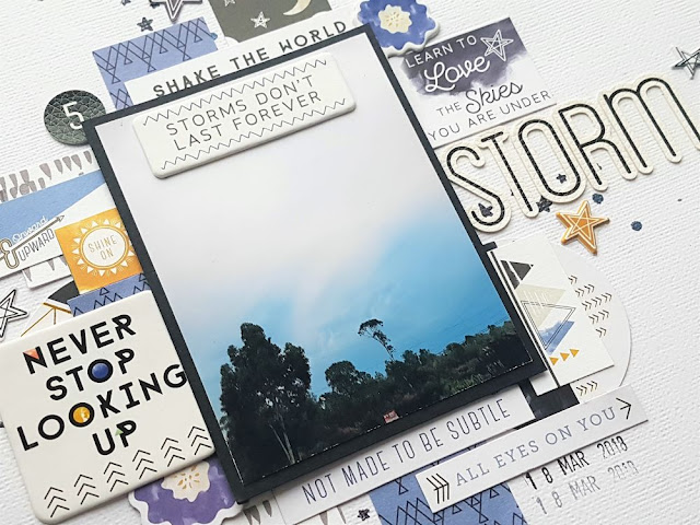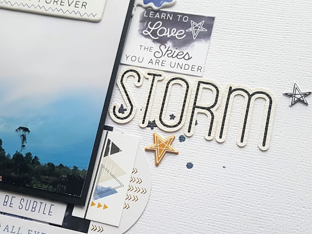 I have had this storm photo printed out for some time now so when I saw that chipboard piece that says, 'Storms Don't Last Forever'' from the Escape the Ordinary collection I just knew I had to scrap this photo. That chipboard piece was definitely the inspiration for my layout this week.