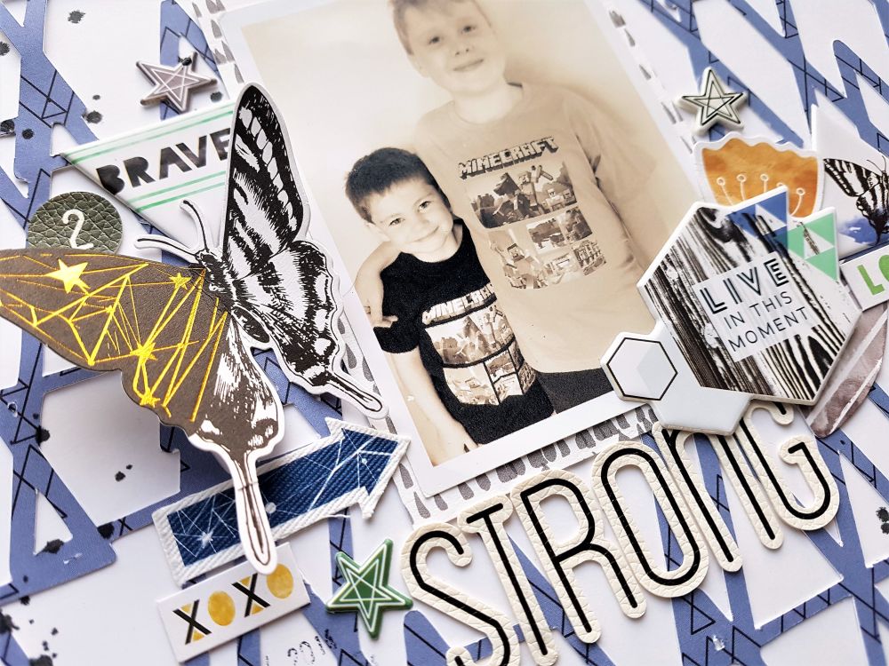 I started off by choosing a triangle background cut file and cut it out of the blue paper from the Escape the Ordinary collection. I then adhered the cut file to some white cardstock and then backed the whole layout with black cardstock.