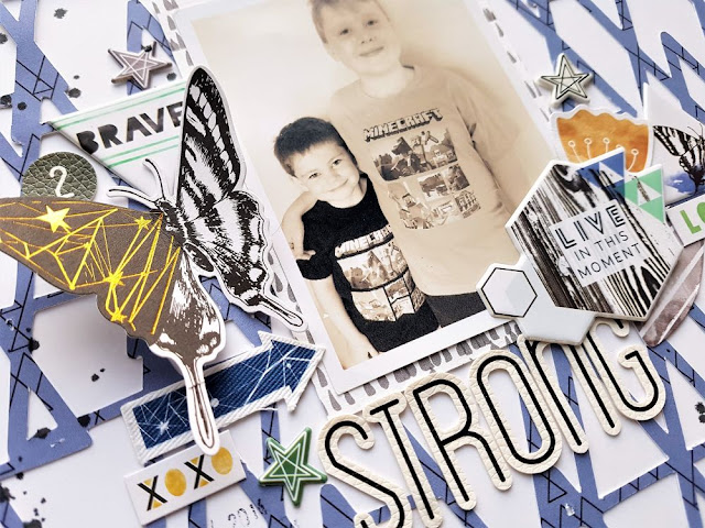 I matted my photo with one of the patterned papers in the 6 x 6 paper pad and adhered it in the centre of the page. I knew I wanted to add that large butterfly from the ephemera pack on the left hand side of the photo. I like how it pops and highlights my photo.