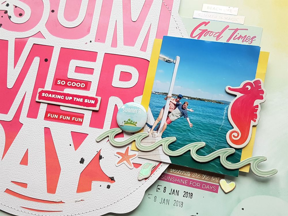 I placed my photo over to the right hand side and placed lots of the phrase stickers and other embellishments around my photo. I also placed a couple of the phrase stickers in the centre of the cut file and over to the left edge as well.