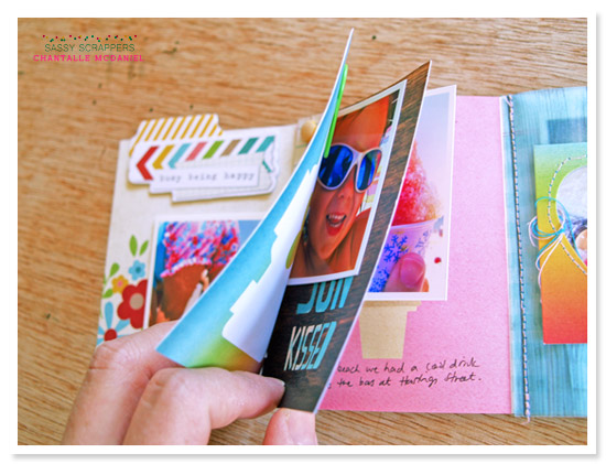 Hello Sassy Friends!Today I want to share this mini album I have created using Simple Stories 'Good Day Sunshine' goodies. The album is based around the bottom strip of this 3x4 jourmalling card paper (shown above) I have folded the outer cards in on themselves to create a gate fold.For more area and journalling space, I have also machine stitched in some utterly delicious Websters Pages Strawberry Fields woodgrain vellum. This is how it looks when you first open it. To the left I have some slide out photos and extra journalling, held together with a brad. The little pocket was created from the woodgrain/chevron printed card from the 3x4 Journalling card sheet. I created this fun mask using the leftovers of the chipboard sticker sheet. Trimmed up it makes a super cute addition to the pocket! Flip the pocket over and you get a sweet heart die cut that I have machine stitched for interest. Pull the vellum up and you get another hidden photo.It has made for a great keepsake of a super hot day spent at the beach back in January! Thank you so much for stopping by!Enjoy your weekendChantalle Sassy Supplies used: