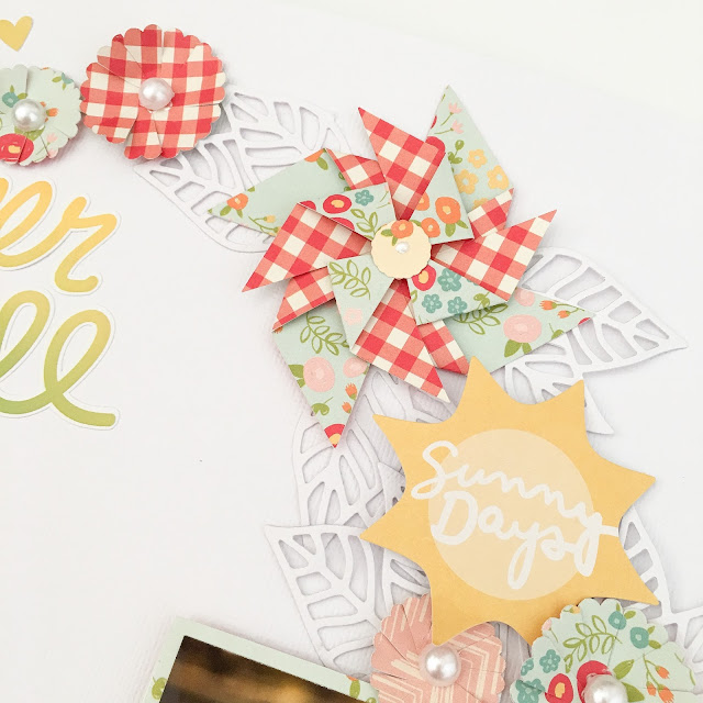 Using some of my favourite Kaisercraft dies from my stash I balanced the flowers with some white leaves.The pinwheel was added for an element of fun, and it screams Summer too.