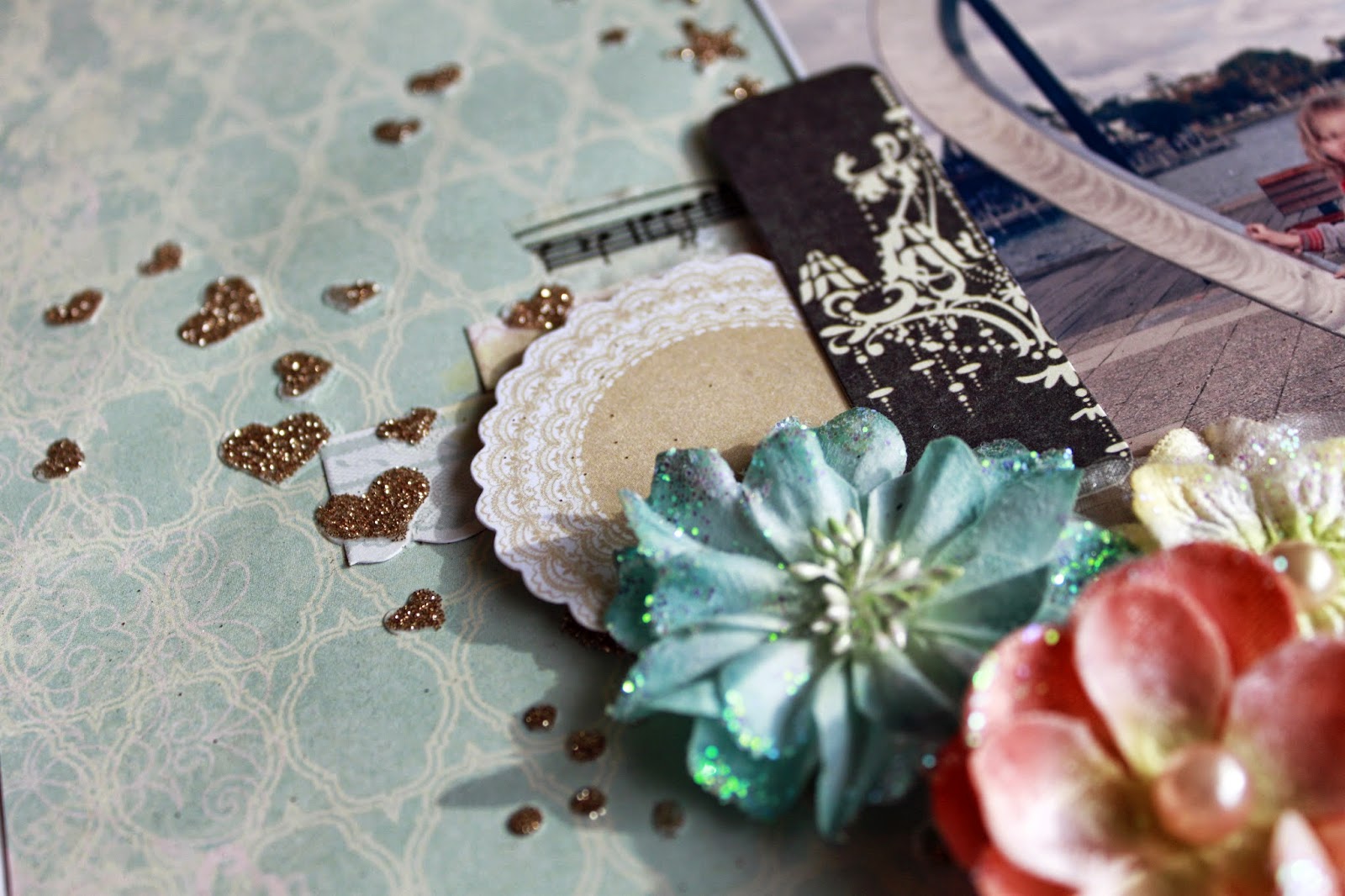 To add more of the whimsy feel to the layout, I used the new to store Heidi Swapp stencils to add a bit of fun to the layout, I used texture paste, and once it was dry, I added some glue and glitter... and dont forget the beautiful Prima flowers to add extra dimension.