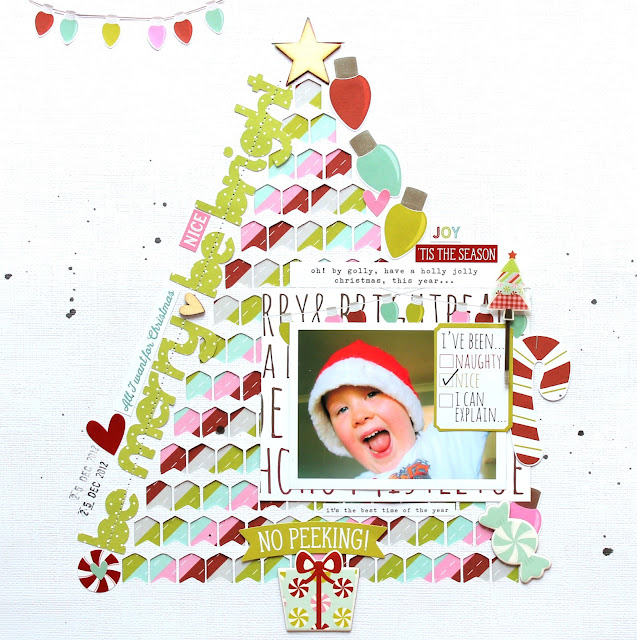I played with the very cute and versatile Mistletoe Kisses collection by Simple Stories again, this time creating a grid design, making use of some of the 3x4 and the 4x6 pieces of patterned paper included in the collection!