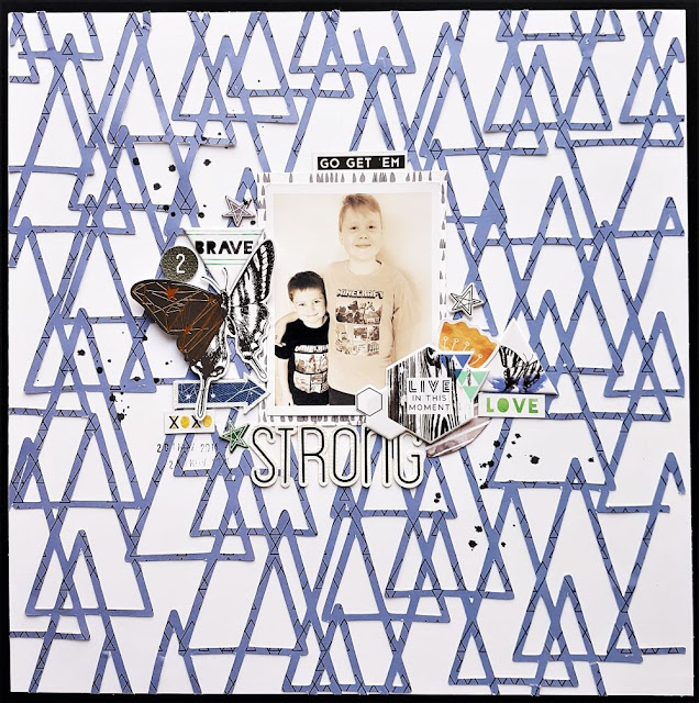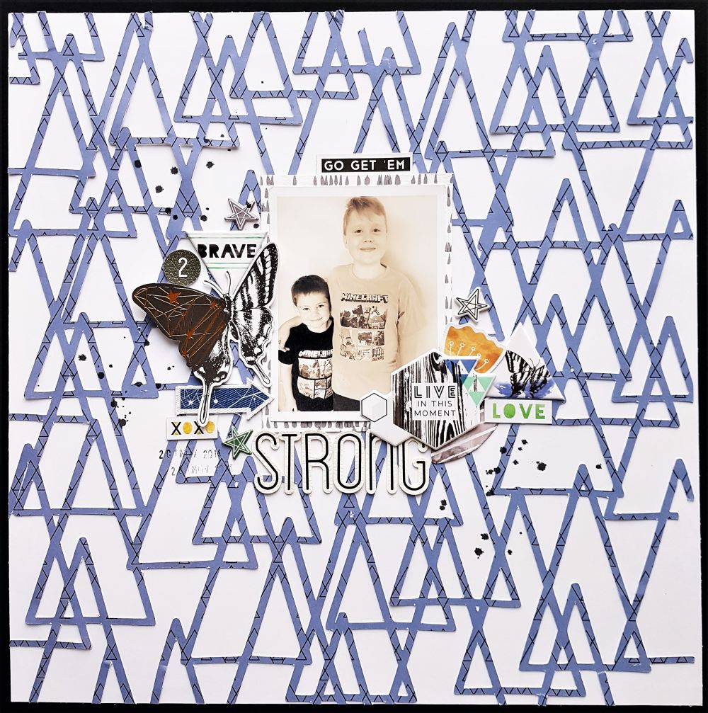 I started off by choosing a triangle background cut file and cut it out of the blue paper from the Escape the Ordinary collection. I then adhered the cut file to some white cardstock and then backed the whole layout with black cardstock.