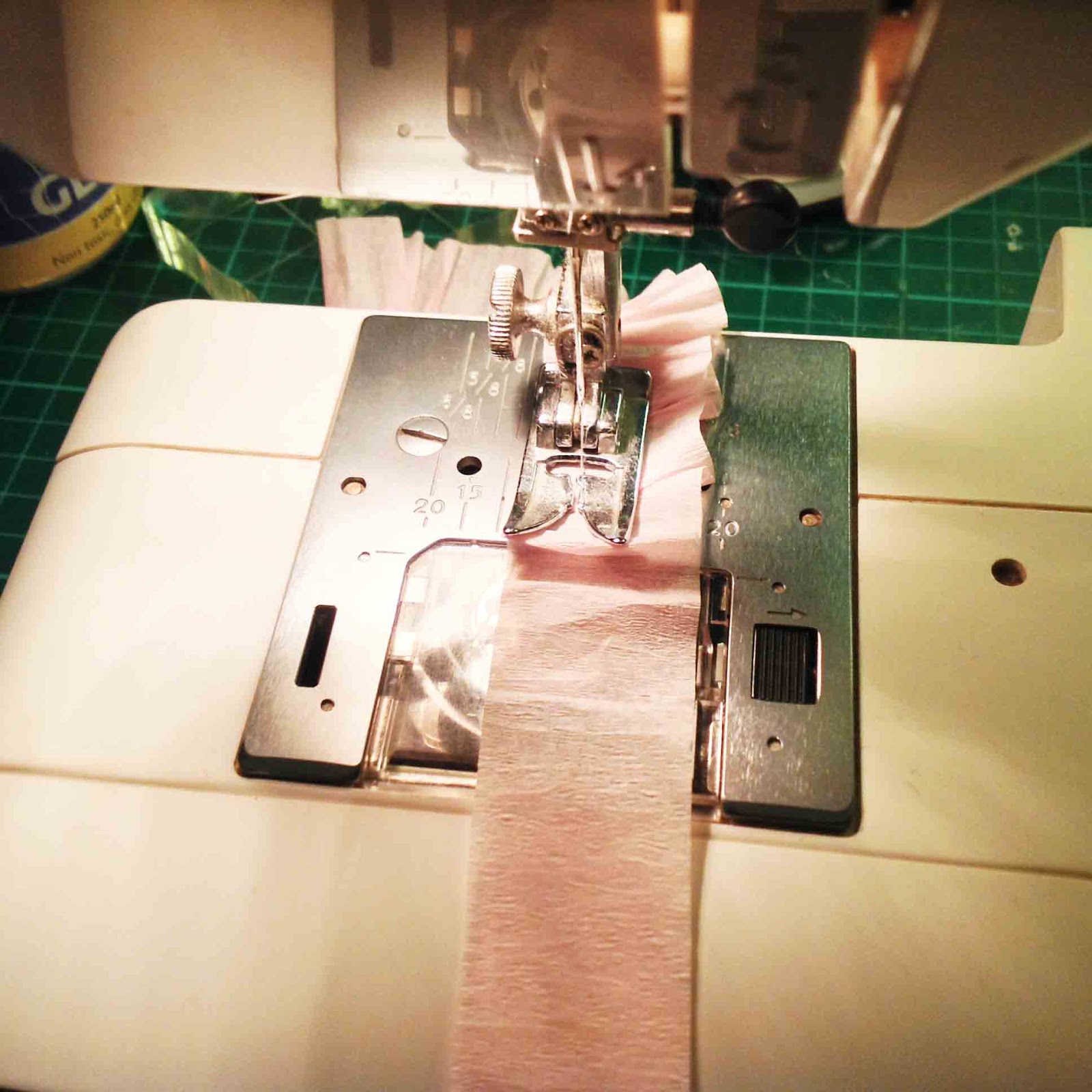 I started by selecting some light pink crape paper and machine stitching it into a ruffle