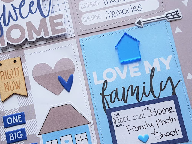 To begin this layout, I pulled out all the grey and blue elements including papers, ephemera, puffy stickers, acrylic shapes and journal cards. I arranged my photo and the journal cards into a design I was happy with.