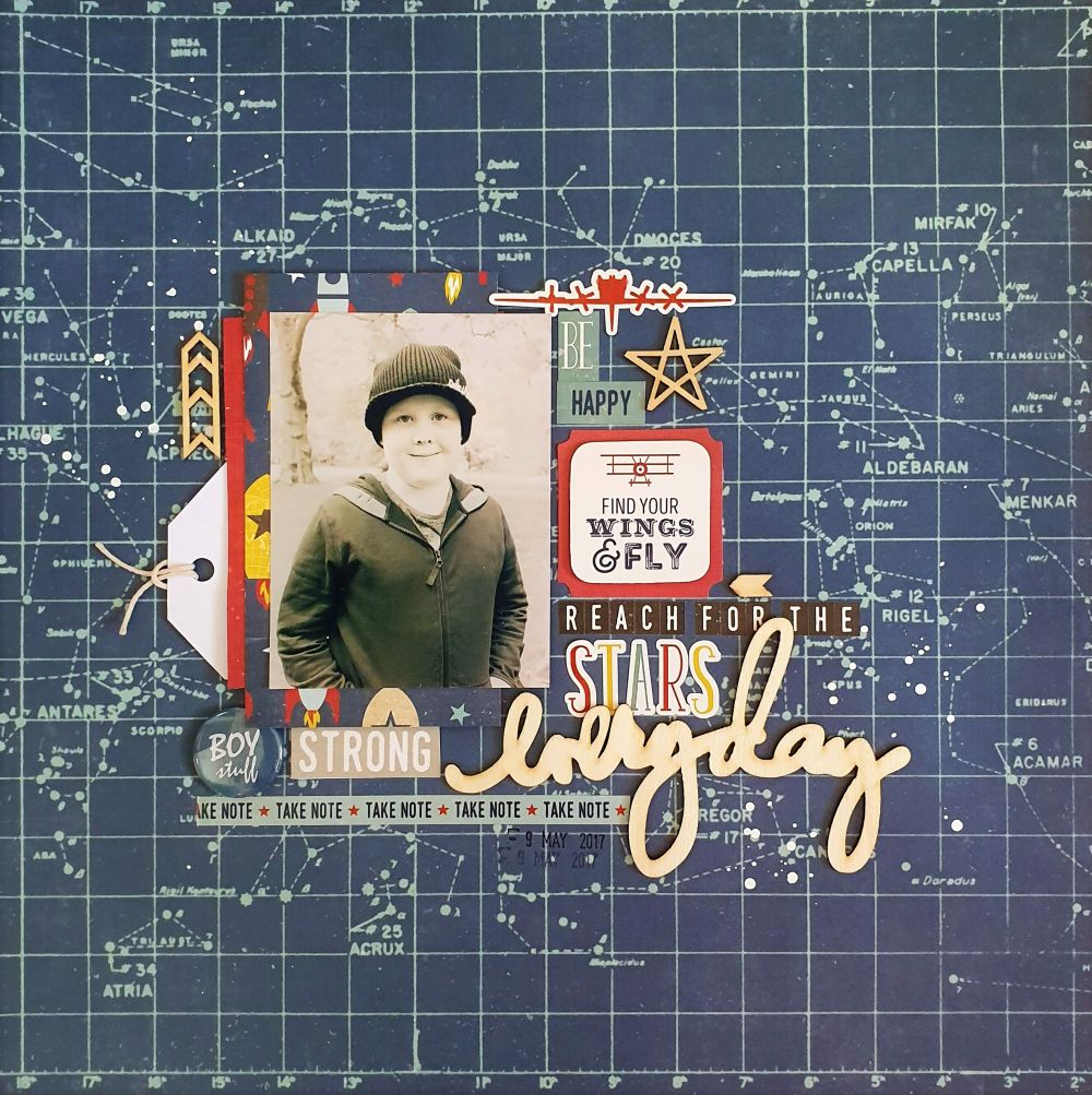 This week the inspiration for my layout came from the blue Cars and Stars paperthat I chose for the background. I really like using darker backgrounds to change things up a little.The stars on the paper gave me the idea to use the title...