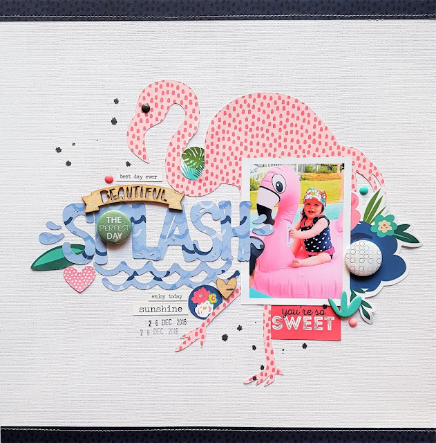 I absolutely love this photo of my niece on a flamingo floatie from last year! It is a perfect photo to use for this collection! I started out by finding a flamingo cut file and cut it out from the pink paper from the Island Escape...