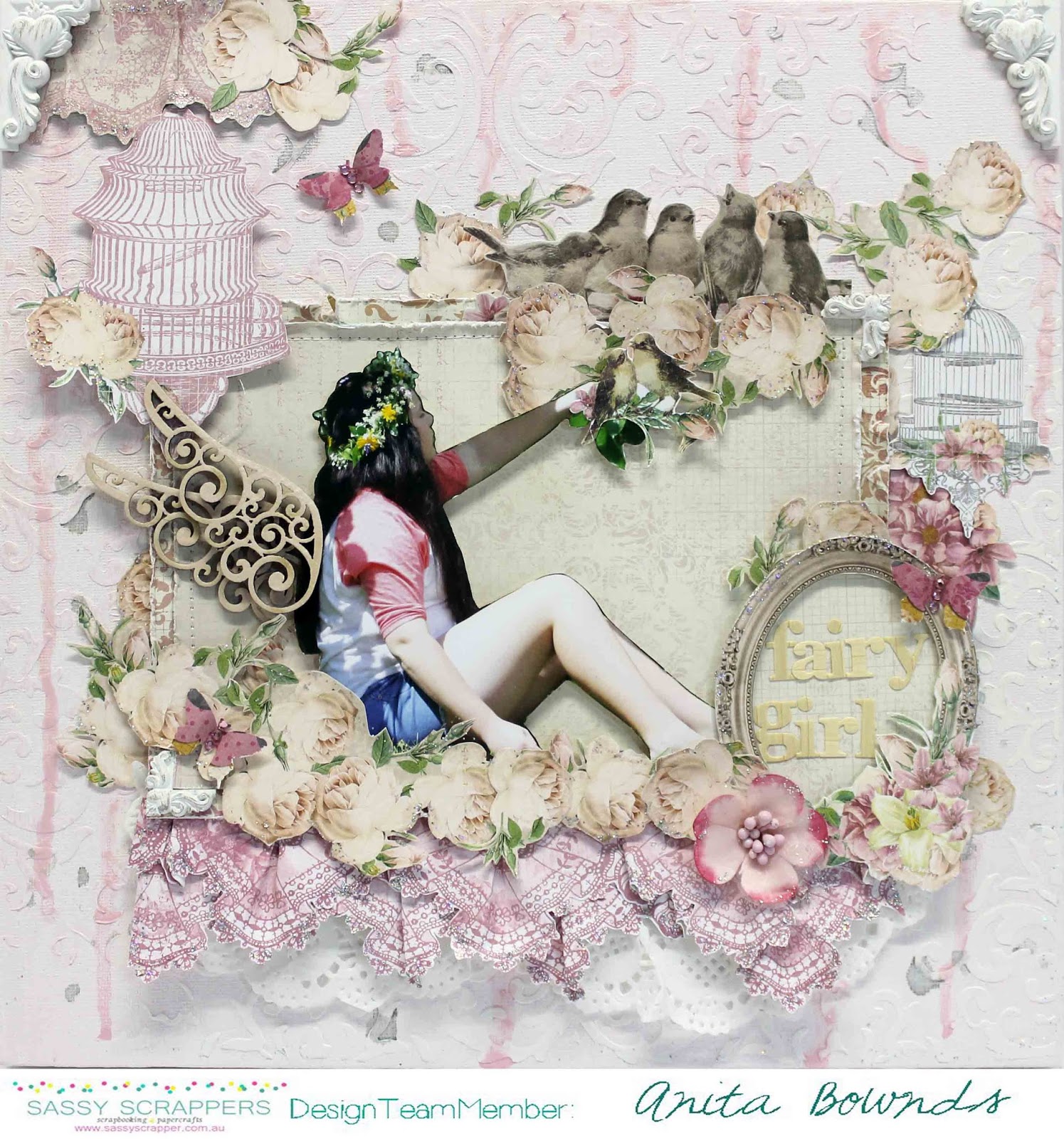 I just love the softness of this collection with all the flowers to fussy cut and those cute little birds so I had this little idea to use a photo of my daughter Kara sitting undera mulberry tree that she would make a cute little fairy girl