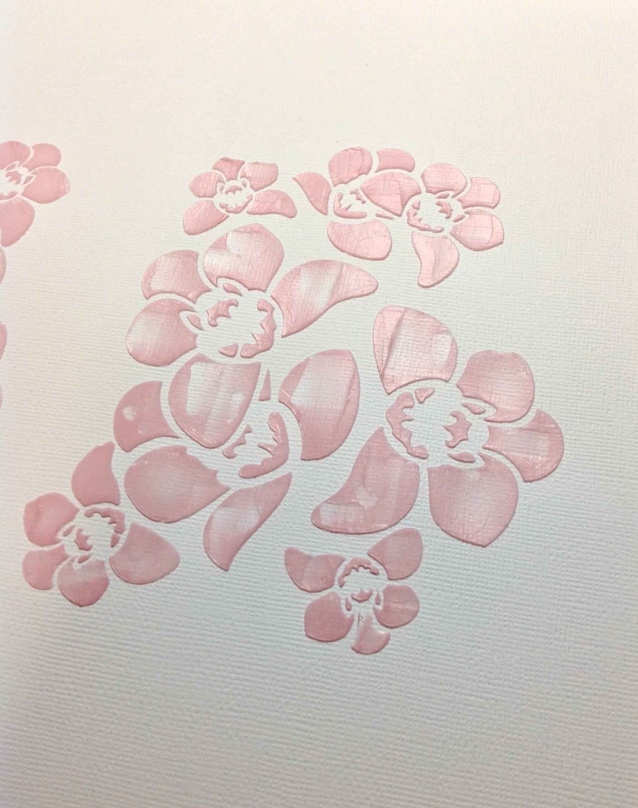 I was inspired by all the flowers and wanted to add pink texture to the background using a ScrapFX stencil and impasto paste and a drop of dusty pink paint