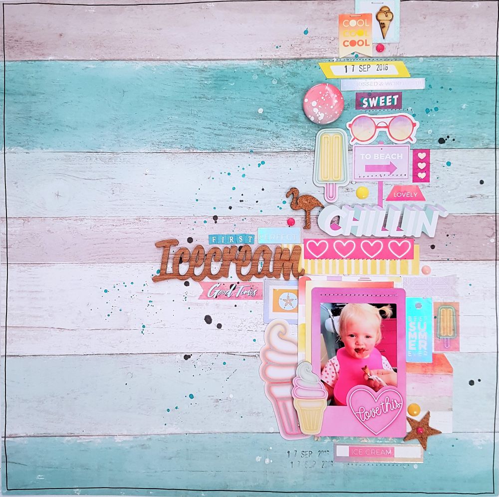 My layout was inspired by one created recently by Anna Komenda! I just love how the brights look against the washed teal background paper! I absolutely love this photo of my gorgeous niece trying out icecream for the first time! It was...