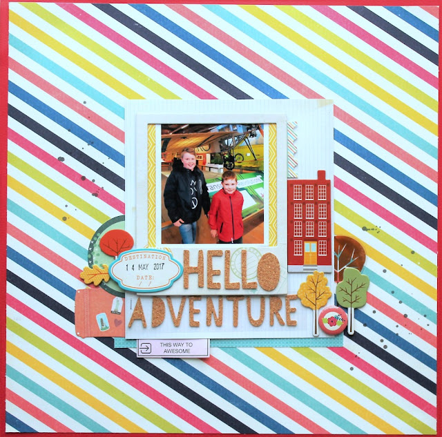 I just love that colourful striped paperand knew I wanted to use it as a background for this layout! The photo I am using is one of my sons from our recent trip to Europe and the UK. We were visiting the Science and Industry...