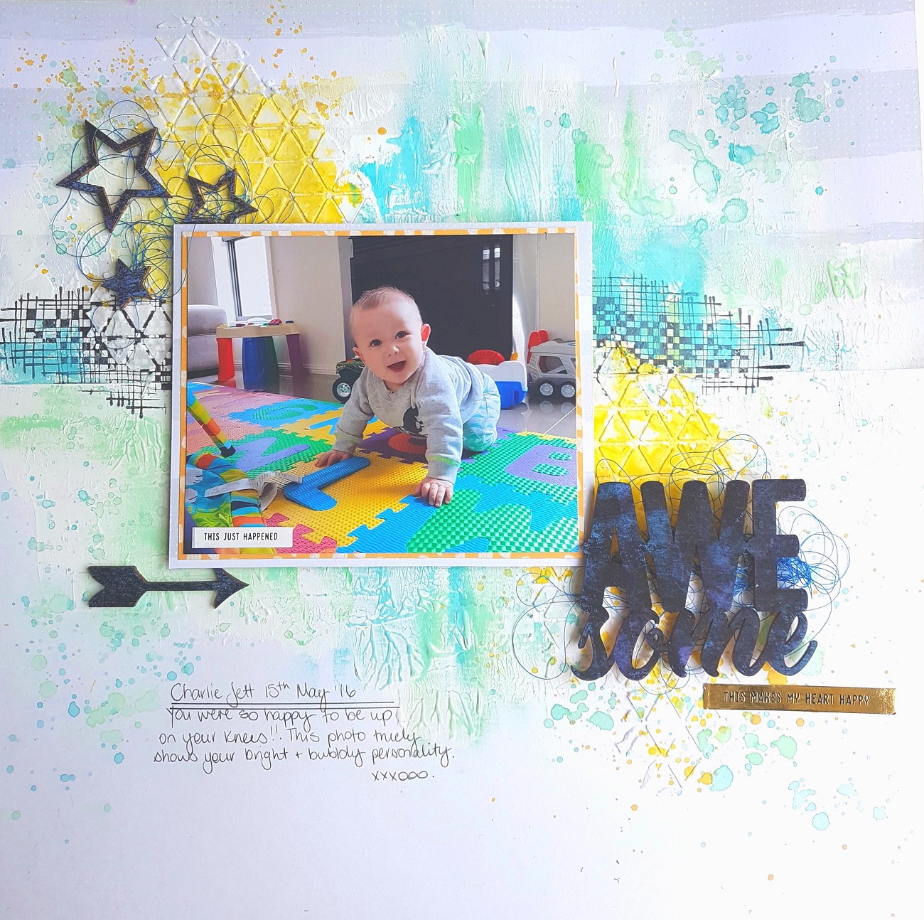 To start my layout I used Cocoa Vanilla You Rock patterned paper In Line with some white cardstock. I then used some Heavy White Gesso and applied with a silicone brush to add texture.