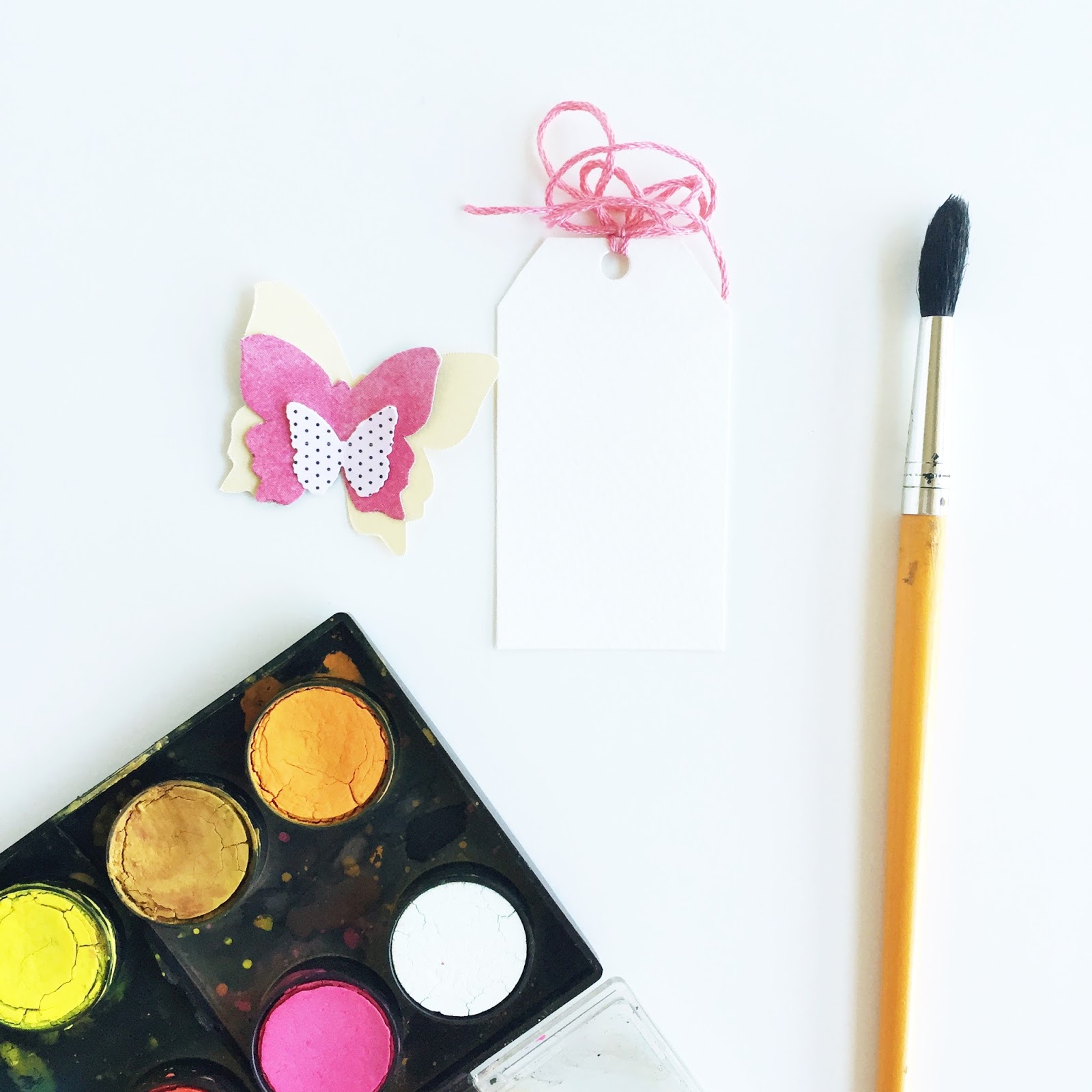 watercolour paper, water colour paints, C'est La Vie patterned paper from Pink Paislee, butterfly die or punch, enamel dots, embroidery thread, foam dots.