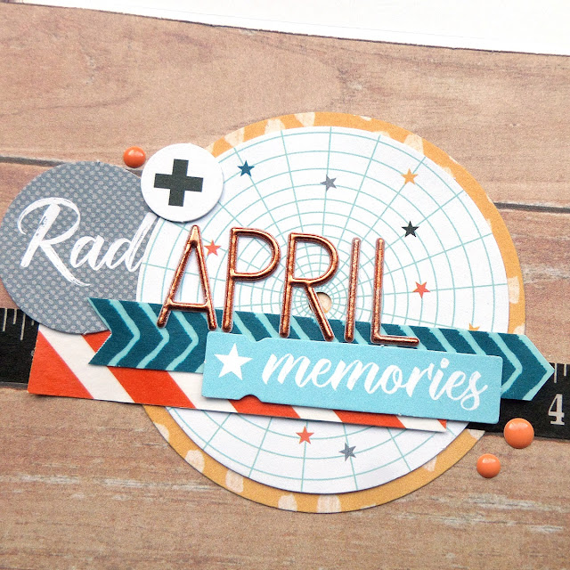 I am documenting April and used the fun copper coloured puffy stickers, along with washi strips, enamel dot shapes and die cut ephemera to create a layered title card.