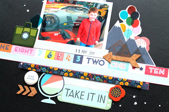 My youngest son has a current fascination with Lamborghini cars! I snapped this photo of him in front of a Lamborghini store in London...I thought the 'Take It In' title was perfect for this layout but all the other elements on this layout are not really relevant to the theme, I don't mind that though, I just liked how the colours looked against the black background!
