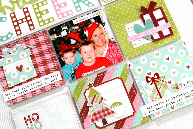 I played with the very cute and versatile Mistletoe Kisses collection by Simple Stories again, this time creating a grid design, making use of some of the 3x4 and the 4x6 pieces of patterned paper included in the collection!