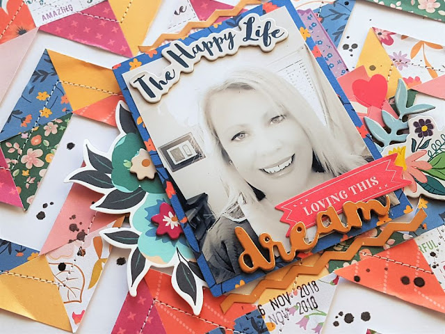 This is quite a time consuming technique, however once you have finished, the result is awesome and well worth the effort! Because the background is fairly busy with all those patterned papers, I kept the embellishing very minimal......just keeping them around my photo.