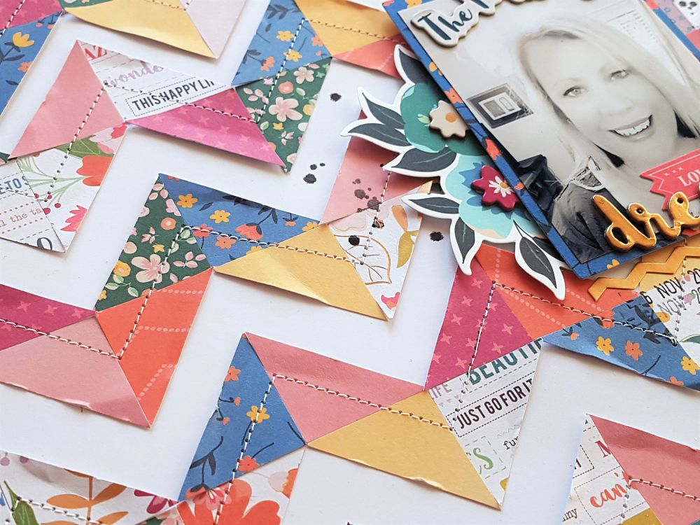 I started to lay them out on the background white cardstock to make a chevron pattern making sure not to have the same paper too close to each other. I used a glue dot behind each triangle as I knew that I wanted to machine stitch through them all once the design was finished.