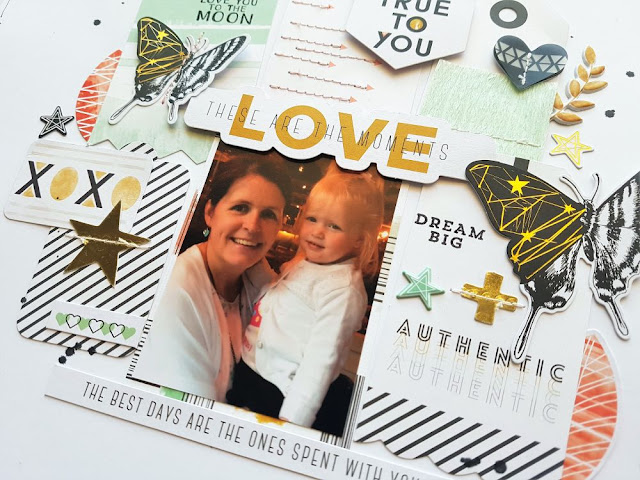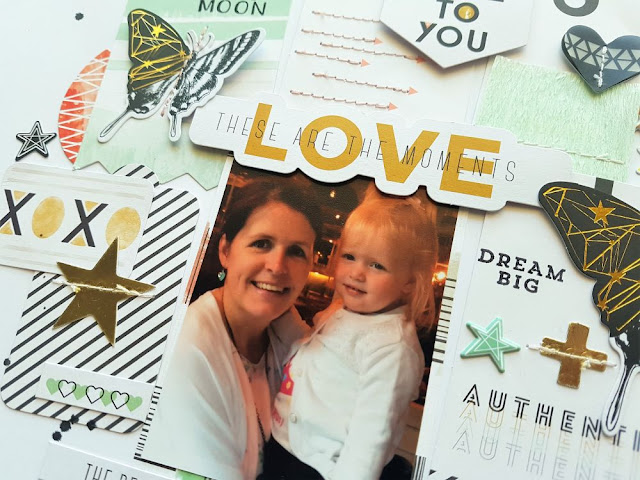 This photo is of my gorgeous sister with her beautiful eldest daughter, I love the tones in the photo so it was a perfect one to use on this layout. Everything co-ordinated perfectly!