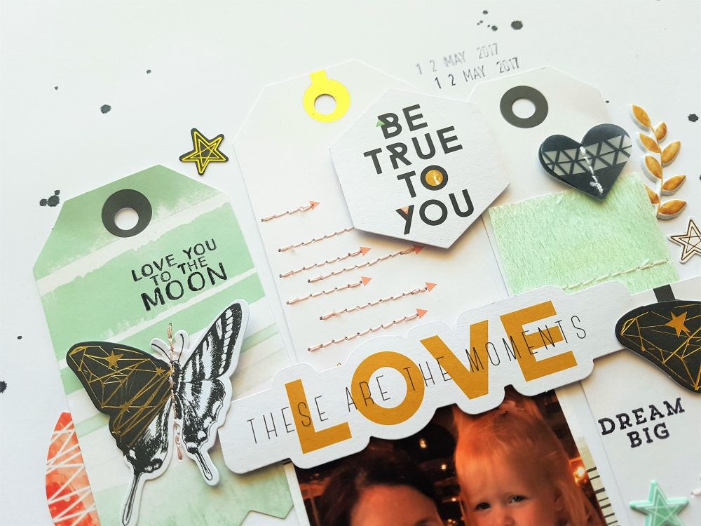 This week I wanted to focus on the gorgeous layered tags included in the Escape the Ordinary collection! I decided to arrange them how I liked them, once I was happy I adhered them down in place. I decided to add a few little extra embellishments to each tag including stitched hearts, stamps, ephemera and puffy stickers.