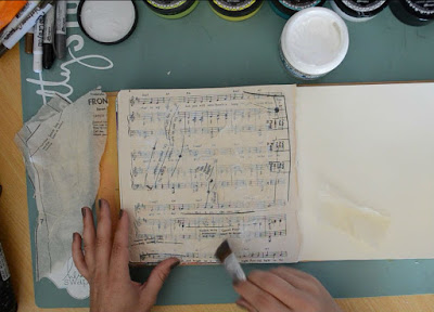 I started by using covering my art journal page with a music sheet, I bought a book from a swap meet last year and I find it is perfect for backgrounds. I also tore up an old dress pattern I got from my mum and used Prima 3D Gel Gloss to adhere it all down.