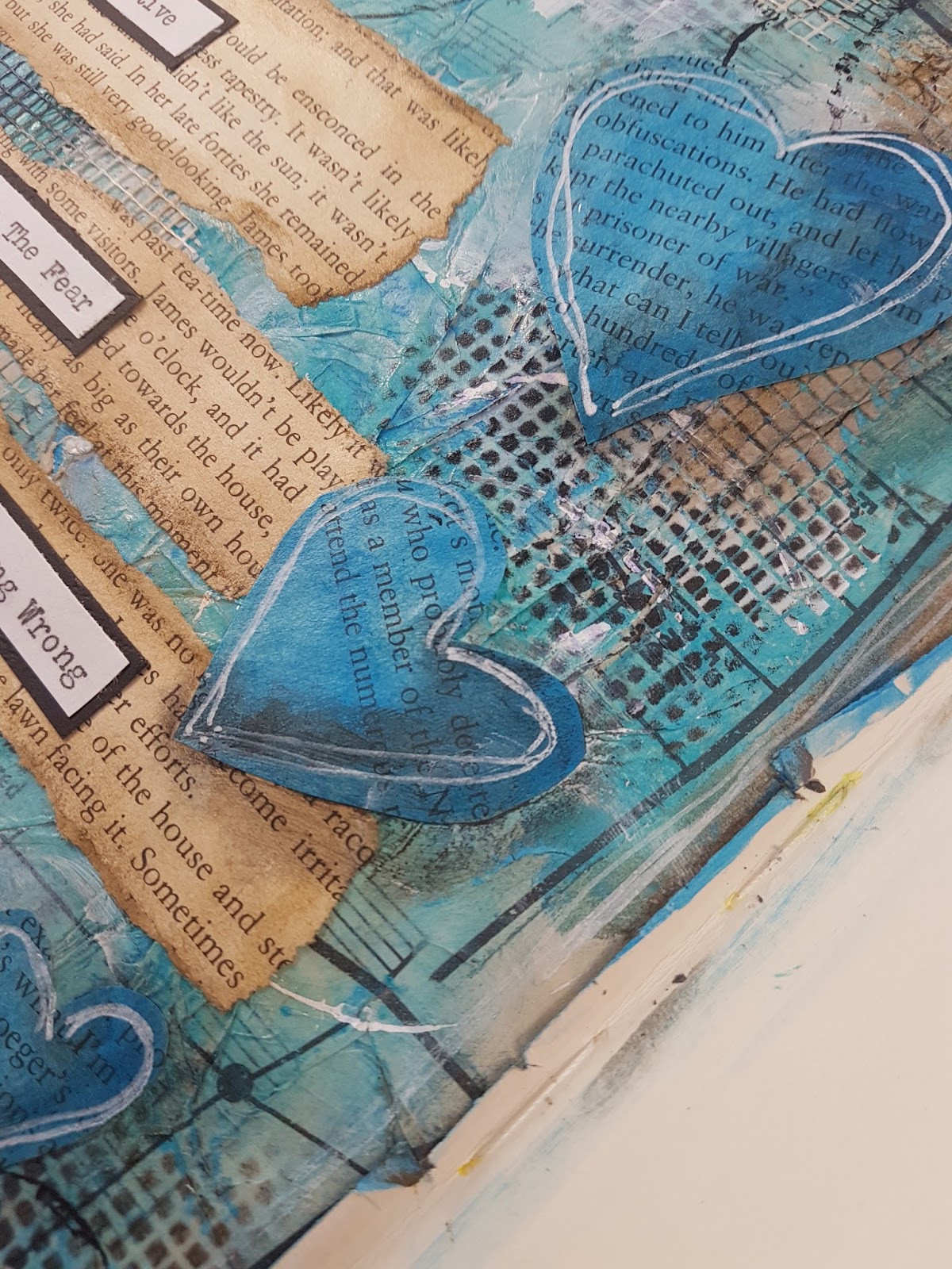 I used my typewriter for my title and mounted onto black cardstock and adhered to these pieces. I then painted some more old paper with London Blue paint and cut out some hearts. I used Black Soot Distress Crayons and a white paint pen for highlights.