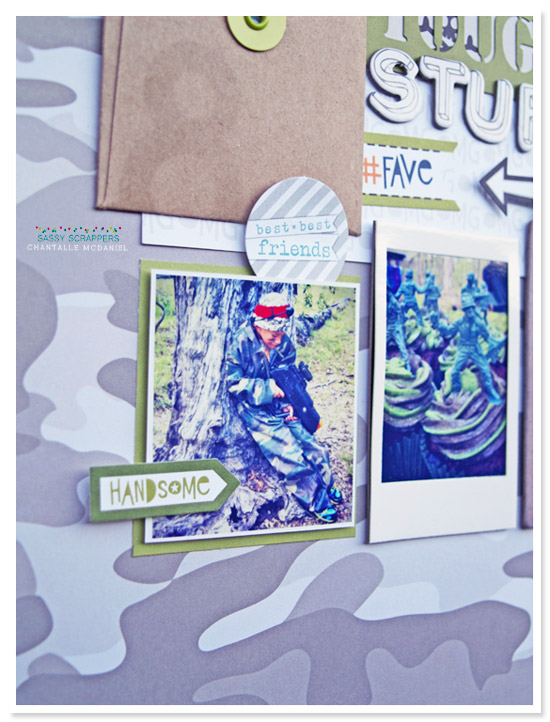 Creating with fabulous Bella Blvd collections once again, this time it's all boy! Rough and tough, I've got my big boy and his mates enjoying the outdoors playing laser skirmish.Bella's 'Max' Collection, with it's cammo papers were exactly what I needed to capture the fun of this day. I wanted a recurring '8' on the page - for the big number on the envelope, I cut a large number on my Silhouette and used it as a once-off template with tinted Versamark.Create intrigue by hiding a