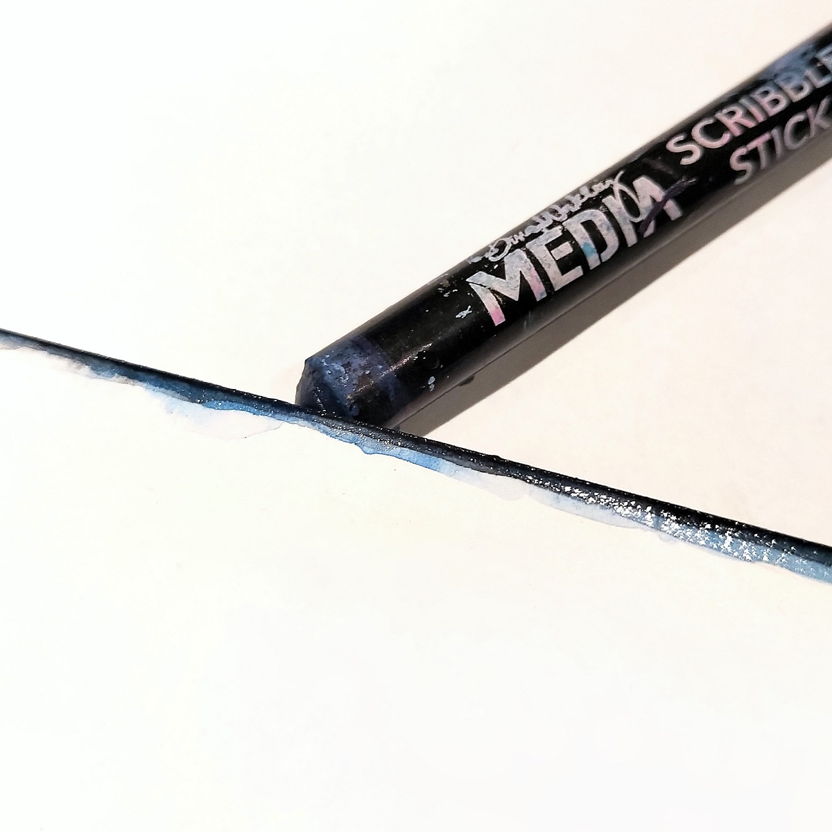 I trimmed off about half and inch from two sides of my base and went around all the edges with a wet paint brush then skimmed the scribble sticks along the wet edge to create a subtle bleed of colour.