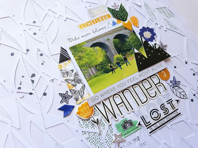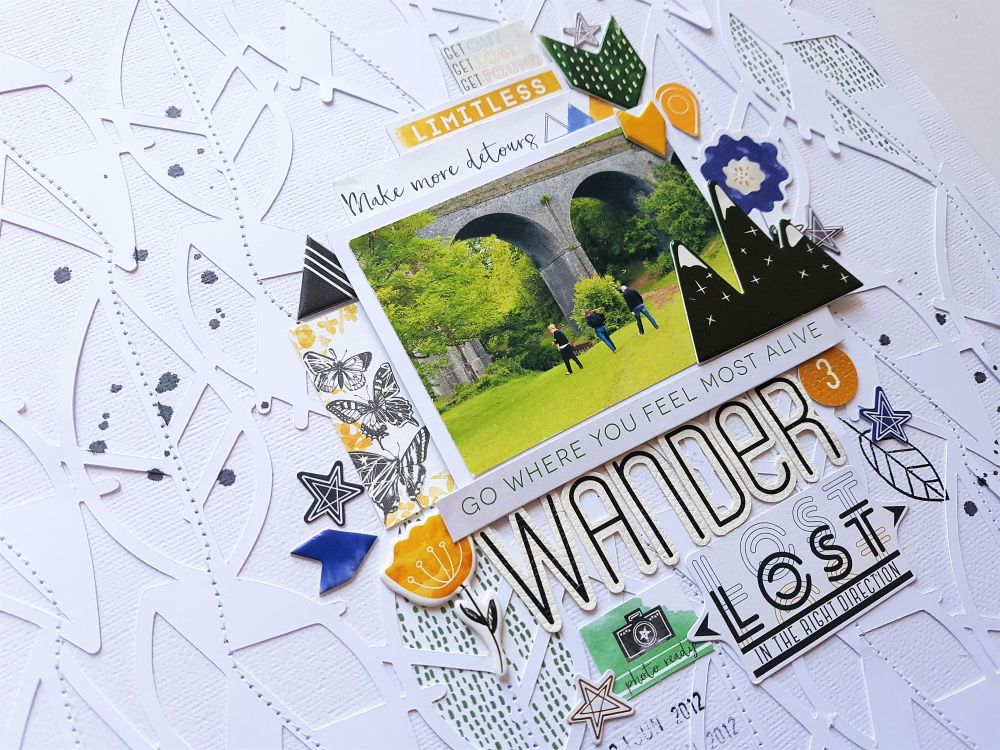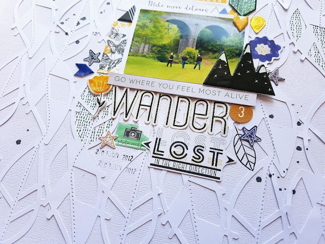 I popped the photo up with some foam tape and embellished mostly around the photo to draw your eye in. I picked out green, gold and hints of blue embellishments as they were the colours in the photo. I chose 'Wander' as my title using those super cool leatherette alphabet stickers!