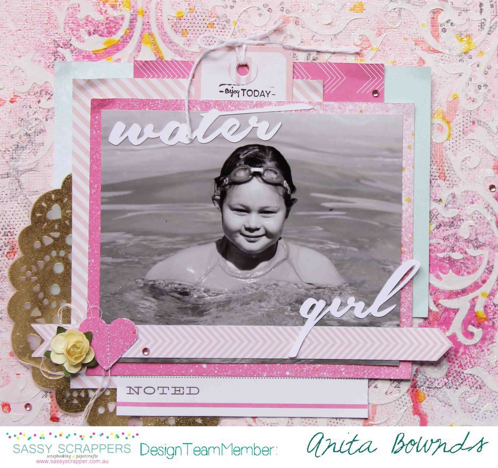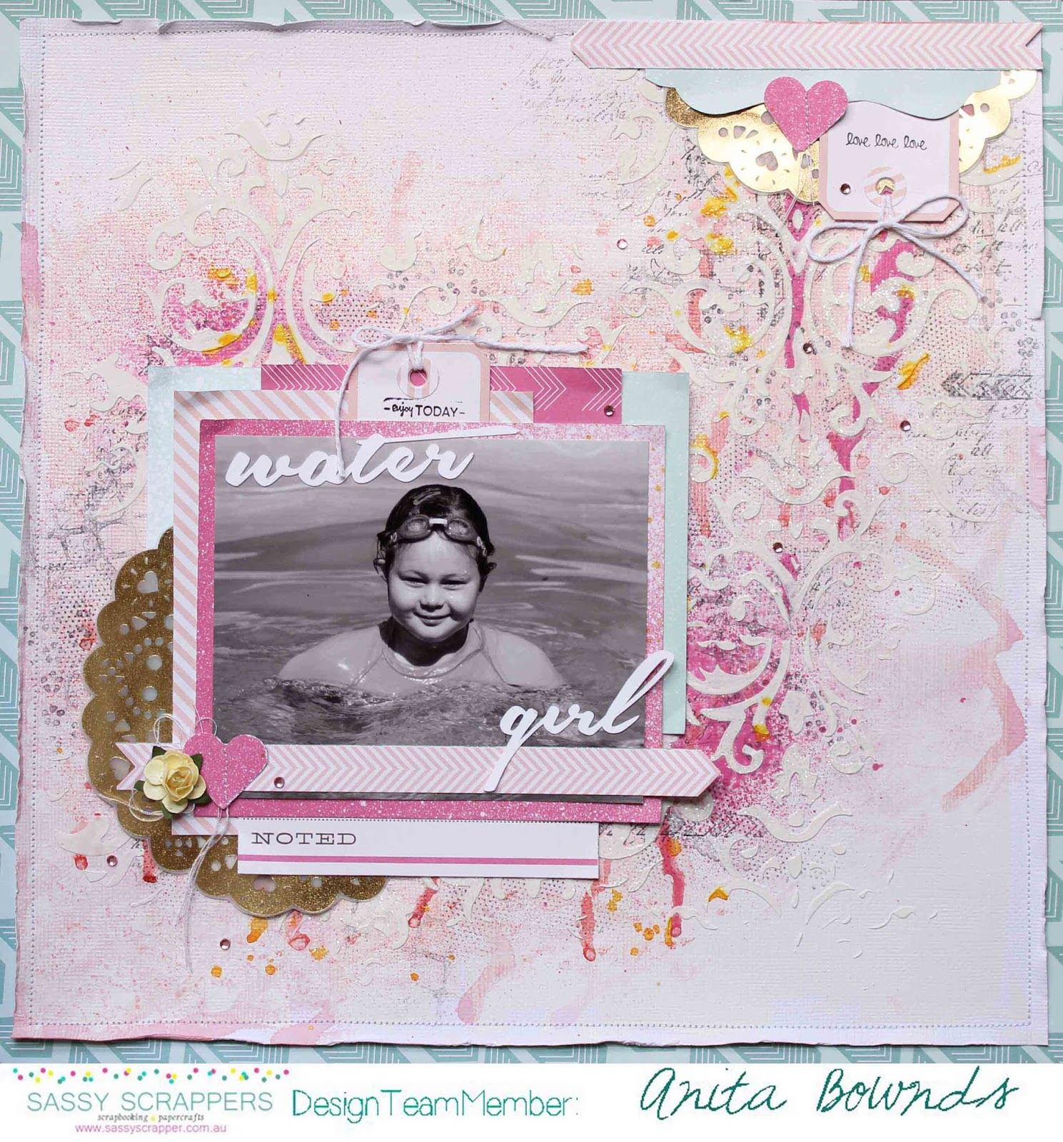 Next I mixed hot pink paint and water in a mini mister and sprayed it on to my background and let it run a bit then I stamped 5 different stamps over my background randomly