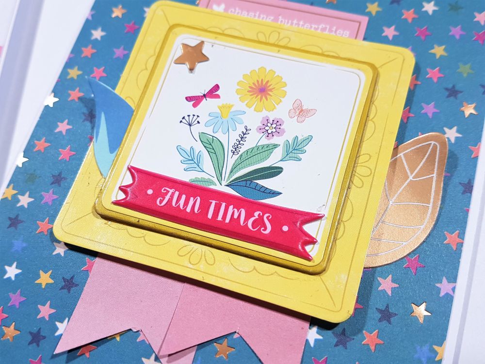 The card below I added both a chipboard and sticker frame and also layered another sticker over the top of the chipboard. I added some banners below and also a couple of the leaf die-cuts.