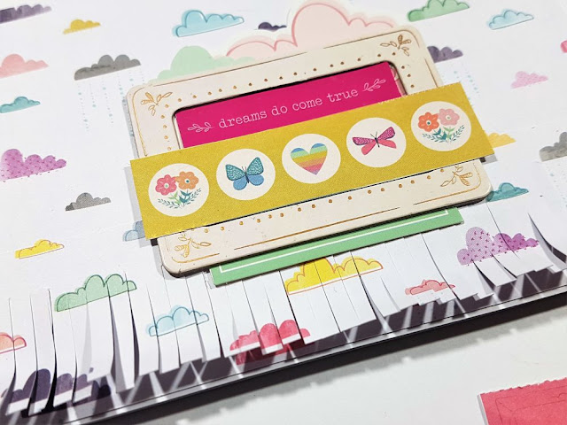 With the card above, I had some fringing left over from a previous layout so I decided to make use of it by trimming it down to fit the card base. I then adhered the exact same paper behind the fringe to make it look like it was one piece. I added one of the chipboard frames in the centre of the card and added some stickers and a paper strip.