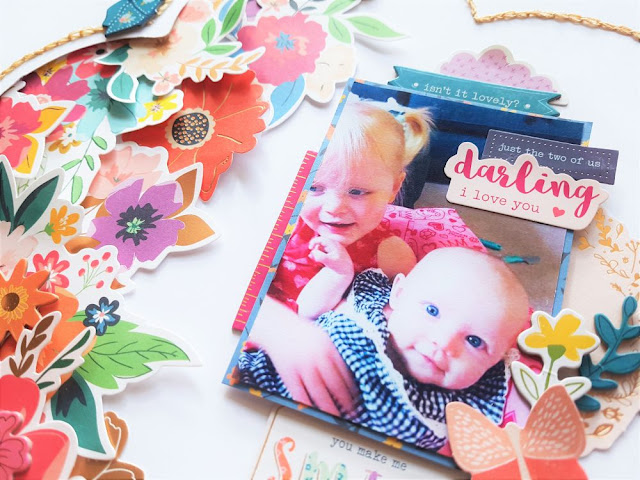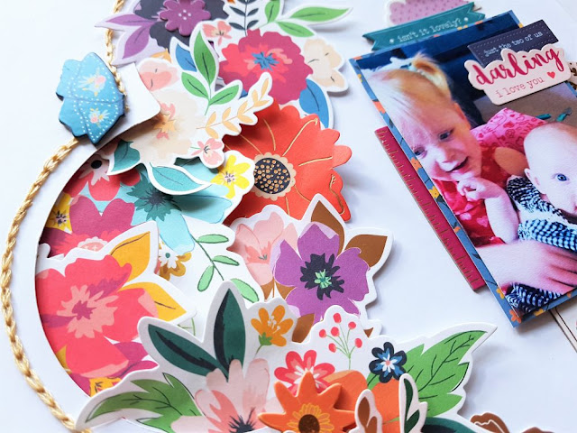 Once the stitching was all done, it was time to adhere my photo down and embellish the page. The next step was to get the flowers tucked into the slit on the left how I liked them. I used the whole packet of ephemera flowers except for the leaves. I used the whole bottom section of the packet for this one page! I bent some of them up to add dimension and also adhered some with foam tape too.