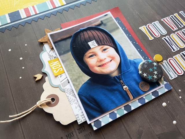 I also cut a 1/2 inch strip from the Stripes paper and added that to under the yellow paper. I took the zigzag sticker from the sticker sheet and also added that under the stripes paper. I then took the 3' x 4' journal cards page and cut some of the cards to add as layers under my photo.