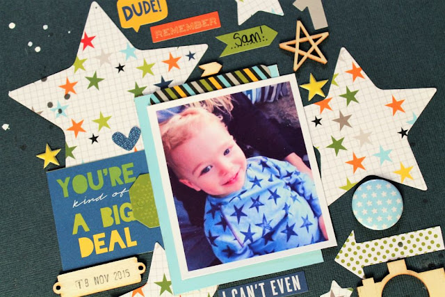 I also added those super cute yellow puffy star stickers to go with the star theme! A little bit of Mister Huey's mist in white and warm calico was the last thing to add to finish the layout.